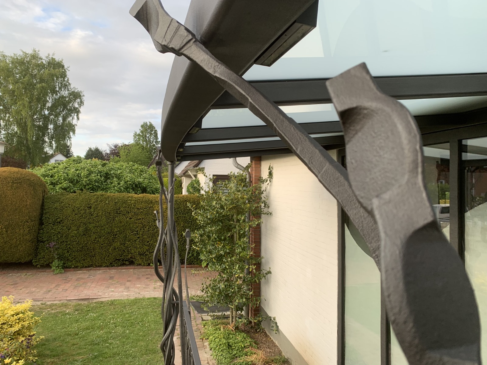 Das satinierte Vordach wird von handgeschmiedeten Pfosten gestützt.